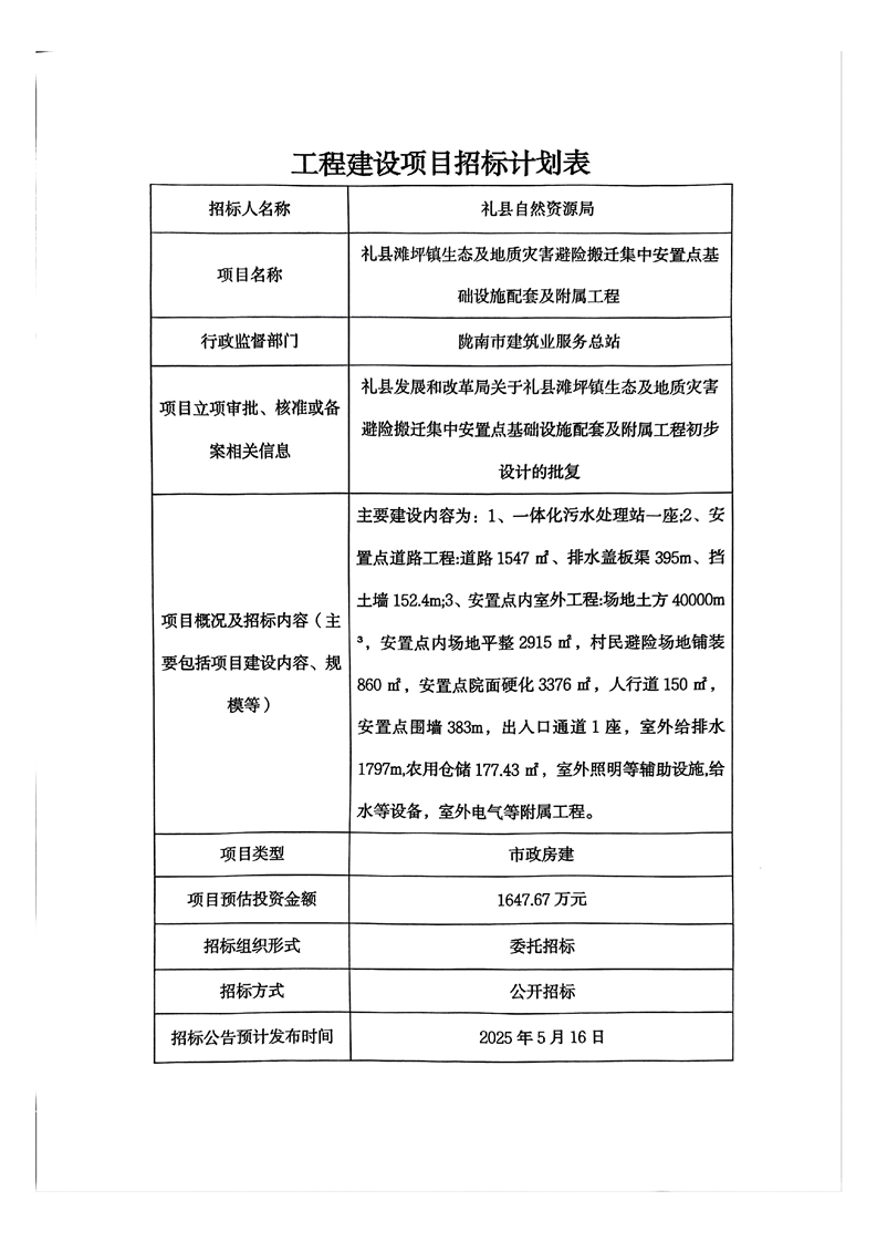 禮縣灘坪鎮(zhèn)生態(tài)及地質(zhì)災(zāi)害避險搬遷集中安置點基礎(chǔ)設(shè)施配套及附屬工程