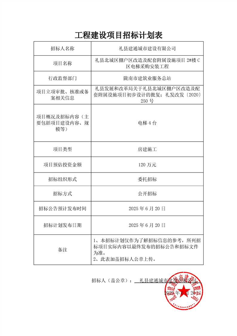 禮縣北城區(qū)棚戶區(qū)改造及配套附屬設(shè)施項(xiàng)目2#樓C區(qū)電梯采購安裝工程
