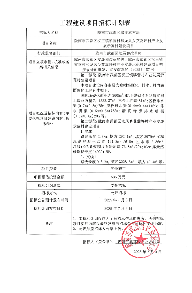 隴南市武都區(qū)漢王鎮(zhèn)黎營村和龍鳳鄉(xiāng)艾蒿坪村產(chǎn)業(yè)發(fā)展示范村建設(shè)項(xiàng)目