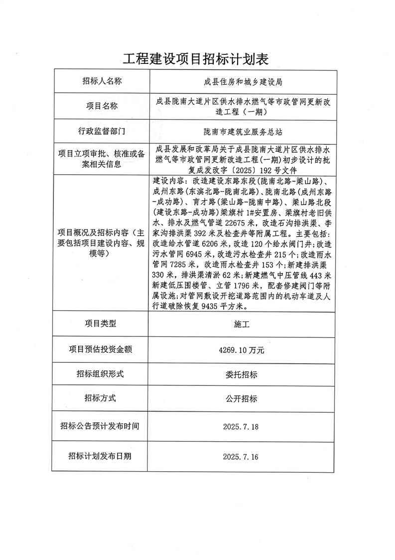 成縣隴南大道片區(qū)供水排水燃?xì)獾仁姓芫W(wǎng)更新改造工程(一期)