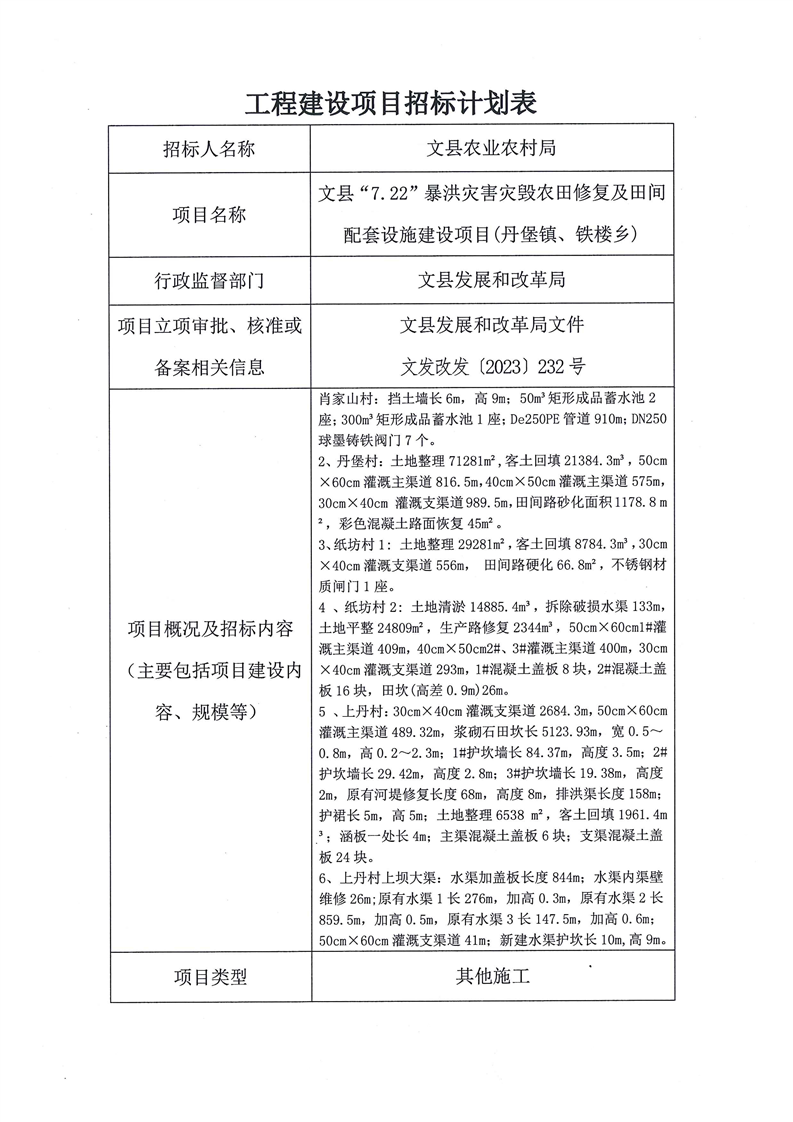 文縣“7.22”暴洪災(zāi)害災(zāi)毀農(nóng)田修復(fù)及田間配套設(shè)施建設(shè)項目(丹堡鎮(zhèn)、鐵樓鄉(xiāng))