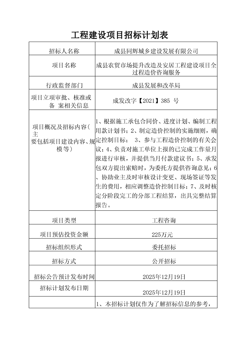 成縣農(nóng)貿(mào)市場提升改造及安居工程建設(shè)項(xiàng)目(一期)全過程造價咨詢服務(wù)