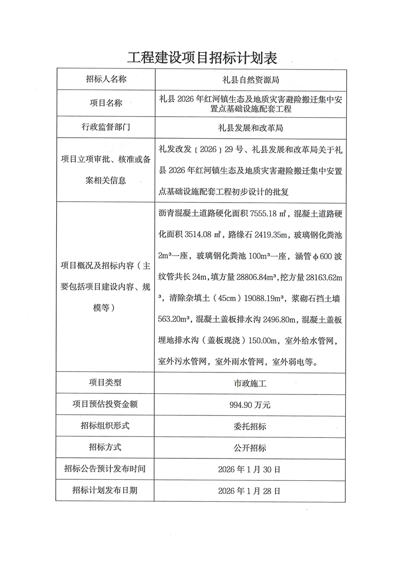 禮縣2026年紅河鎮(zhèn)生態(tài)及地質(zhì)災(zāi)害避險(xiǎn)搬遷集中安置點(diǎn)基礎(chǔ)設(shè)施配套工程