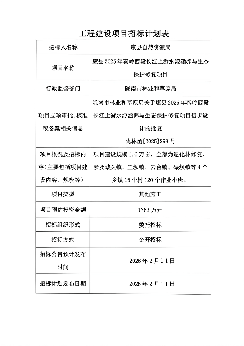 康縣2025年秦嶺西段長江上游水源涵養(yǎng)與生態(tài)保護修復(fù)項目